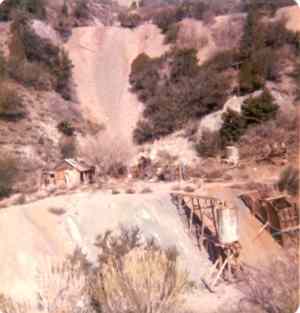 standing. UPDATE: The old hotel in Jacob City fell down about six or seven years ago. I visit there regularly and was last there this past October. There are still one or two small wooden structures standing along the canyon walls, though they wont be around much longer as Jacob City is high up in the mountians and the snow takes a heavy toll on the old buildings. I assume this is what caused the old hotel to fall as not to long ago it was still possible to walk around on the upper floor. Some of the roads in Jacob City are quickly washing away and getting in by vehicle is a more difficult but can still be easily done by walking only a short distance. For quite some time the only way to get ore out of Jacob City was through Dry Canyon, a route that even in a jeep is very slow and rough. Ore had to be hauled down the canyon in small carts. For a while an arial tramway was built but was also slow. A man by the name of Matt Gisborn owned the Mono mine south of Jacob City. Matt Gisborn carved a long toll road up from the Dry Canyon across the face of the mountain on a gentle grade eight miles northwest to the town of Stockton. (1) A small town grew up around the Mono mine and was given the name of the mines owner, Gisborn. The mining around Gisborn reportatly lasted a bit longer than that of Jaboc City but was not on the same scale.(1) Some more recent mining has been done in the area but nothing I would consider modern. While it is possible to reach Jacob City by two wheel drive vehicle, a person would be much better off in a four wheel drive vehicle. As I mentioned the road from the toll road down into Jacob City is deteriorating at a fast pace, there are several roads that go all over that mountian and it is possible, via a dirt road to reach the town of Ophir on the other side of the mountian, though a person would definatly want a four wheel drive vehicle to do so. Personally I have only attempted this on my off road motorcycle. About a month ago there was a news report that they (BLM or some other agency, I forget which) was going to be blowing the old mine entrances closed for safety reasons. Personally I feel this is not needed as Jacob City is out of the way of anyone who would simply be on a "Sunday drive" and anyone entering the old mines should know the great risks they are taking and make sure that all precautions have been taken. Mine entrances are scattered all over the canyon and many open up right on the side of the roads. - Brian Snarr UPDATE: 6/10/00 We visited Jacob City, Tooele County, Utah this weekend. We met the new owner of the property, who says he is going to close all the mines down and started putting "no trespassing" signs up. There are two ways to get there, one is from the Stockton side and one is from a road that goes to Ophir, which splits at the very beginning of the road and heads up to the canyon to the left. There is very little left, as you can see from the pictures. The new owners said there were other buildings over the hill, but the snow is still blocking many of the higher roads. We will keep you informed. Robert Mair and Maida Murphy UPDATE: There is one older cabin that I know off at the top of the canyon of Jacob City (over Commodore Pass). I don't have a estimate of its age at this time. As to accessibility of the ghost town: We had intended to come into Jacob City from Ophir (using Serviceberry Canyon). [25 Oct. 2000] The road had been posted (it was not as of last week). We then decided to approach from Stockton. We were able to get up to the main trail into the Site. It had been improved but was now gated and posted. The next week [2 Nov 2000] we attempted to reach Jacob from Dry Canyon (the bottom entrance). We were turned back by snow but saw no postings. However, upon driving down the canyon we noticed two holes had been excavated at a narrow in the road. Based on its location (it can't be bypassed) we believe these to be in preparation for a gate. By Summer 2001 it is likely that Jacob will be inaccessible by vehicle and foot access will likewise be prohibited. Is this the owner's attempt to limit his liability or is development planned? I see that Robert Mair has spoken to the new owner. Perhaps he knows what is planned for the site. Mont Andersen |