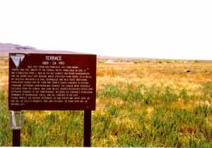 | (From BLM sign) Terrace was the largest of the Central Pacific towns built in Utah. It was established April 1, 1869 as the maintenance and repair headquarters for the entire Salt Lake division, which stretched from Ogden UT to Wells NV. Facilities included a small roundhouse and a switchyard. Population figures vary from a couple hundred to several thousand, depending whom was counted. The Chinese were generally excluded from the census, and some tallies counted registered voters only. Submitted by: Jim Aldrich | ![]() Terrace Courtesy Jim Aldrich |