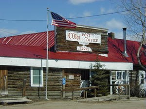 | Located approximately 10 miles northwest of Pinedale, the tiny village was named after Cora House. The Cora post office, the first building to be erected in the village was first established in the late 1890's. The post office building is made of hand-hewn, sturdy logs transported from the Upper Green River. At one time Cora, a popular road stop for trappers, loggers, and weary homesteaders boasted a successful saloon, blacksmith shop, dance hall and a town newspaper. The town reached its peak population of between 400 to 500 people (I think) during the steady influx of settlers in the 19th century to the wild west, and after WW2, Cora�s population slowly began to drop as the towns people of this era joined the trend of farming and ranching on there own property, and also on a larger scale. But many families remained loyal to Cora. Submitted by: Ryan J. Hill |