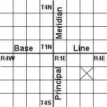 The Township and Range system, sometimes called the Public Lands Survey System, was developed to help parcel out western lands as the country expanded. The system takes many western states and divides them up using a base line and a principal meridian: ![]() As you go to the east or west of the principal meridian, the range increases in that direction. If you go north or south of the base line, the township increases. This system divides the land up into townships and ranges that are 36 square miles each. In the diagram above, the square with the X in it would be defined as township 2 south (T.2S), range 3 east (R.3E). Each township and range is then subdivided into 36 sections. Each section is one mile square. Individual sections are then subdivided into half sections and quarter sections and so on. On a topo map, you will notice a grid with red lines and text crisscrossing the map. The lines represent the boarders of the various sections in the township and range of that area. In the map below you can see sections 23, 24, 26 and 25 of T.22N, R.7E. ![]() There are many other symbols on USGS topographical maps. Here are some of the most common: