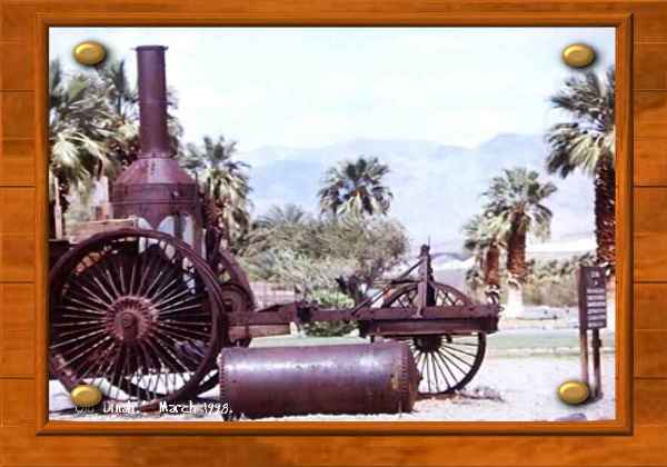 This 110-horsepower steam tractor was originally built and operated by the Pacific Coast Borax in 1894 for use at their company holdings at Borate, California. It was tried as an experimental means to replace mule teams to haul borax to Daggett on the Santa Fe Railroad, but proved to be too unwieldy, cantankerous and unreliable. As with all such devices, either animal, human or object, it soon picked up a nickname, "Old Dinah." In July of 1909, Joseph R. Lane, a Rhyolite merchant, purchased the tractor and put it in service between there and the Keane Wonder Mine, in Death Valley. His Keane Wonder Traction Company used the tractor to haul supplies between the two points, pulling two trailers with 20 tons of freight and crawling along at 3 to 4 miles per hour over Daylight Pass and down Boundary Canyon, past Hell's Gate to the Keane Wonder. Old Dinah usually consumed 3000 gallons of oil and water along the way, but Lane realized a profit of about $200 per trip utilizing Old Dinah. In November of 1909 however, Old Dinah blew her boiler, due to years of hard desert water clogging her boiler tubes. Dinah sat where she died for 20 years, a desert oddity sitting alongside the road in Boundary Canyon. In the late 1930's, the Pacific Coast Borax Company spirited her away one night and placed her as a display at their new tourist facilities at Furnace Creek. She sits there to this day. Photo taken March 1998.