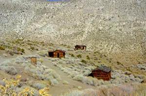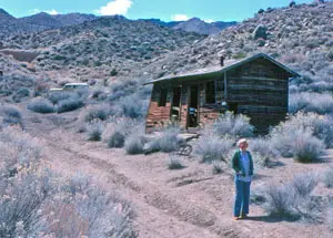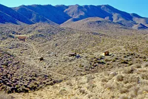East/south from Teakettle Junction in Death Valley NP, thru Hidden Valley. Or east on Hunter Mountain Road, likely closed by snow in winter and late spring REMAINS: Dumptruck, dugout, building remains |