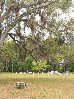 Near intersection of 205 and 13 NW of Bunnell. Take N. Old Dixie Hwy, A.K.A. "The Old Brick Road," North out of Espanola 11 miles into St John's County. This stretch of road is part of the original bricked Old Dixie Highway and is listed on the National Register of Historic Places. REMAINS: Espanola Cemetery, late 1800s |