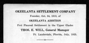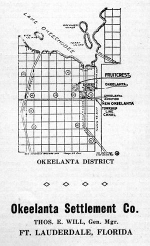| Okeelanta was a planned community, started in 1913 by Thomas Will and ostensibly owned and operated under the business name Okeelanta Corporation. The name itself was derived from a combination of Okeechobee and Atlantic. It was meant to become a model example of how the Everglades could be made into successful farming land. Early settlers included R.A. Little, S.A. Hughes, Herman Walker and Lawrence Will. Despite many problems such as floods, freezes, wild animals and mosquitos, by 1920 Okeelanta had 200 residents, a school and town hall. Irish potatoes, corn, beans, tomatoes, and eggplant were grown and shipped out. After surviving more problems thru the 1920s, Okeelanta was flooded and destroyed by the Hurricane of 1928. Thomas Will attempted to rebuild and re-start the community, however due to lack of financial backing The Okeelanta Corporation soon declared bankruptcy and the town was finished. Submitted by: Jim Pike |