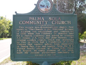 Now located along the edge of the city of Bradenton. State Road 64 (Manatee Ave) west to 75th Street, head north and follow the sign to the original community area. Further north on 75th leads to Desoto National Memorial Park, site of his original 1538 landing in Florida. Palma Sola Blvd south off of SR 64 leads to Palma Sola Park, an area of very nice historic homes from the 1920's and 30's. REMAINS: Palma Sola Community Church, cemetery, original wooden bridge remains |