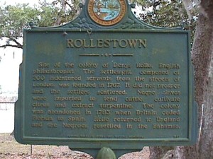 | In 1767 an English Philanthropist, by the name of Deny Rolles established an agricultural colony on the banks of the St John's River. This being at the time of British Florida, he brought indentured servants from the streets of London who were primarily vagrants, beggars, debtors and prostitutes. This large plantation on the river was an agricultural failure due to the fact that the 200 people Rolles brought from Britain knew nothing about farming. In addition, they could not adjust to the tropical wilderness and hard work required so they eventually scattered. After this time negro slaves were brought in to work the citrus crops, develop a turpentine enterprise and raise cattle. The community was abandoned in 1783 when the British returned Florida back to Spain. Deny Rolles returned to England and the slaves migrated to the Bahamas. Submitted by: Mike Woodfin | ![]() Historical Marker on the site of Rollestown courtesy Mike Woodfin |