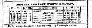 | Venus was a stop along the Jupiter & Lake Worth Railway, which ran from 1889 to 1895. It was known as the Celestial Railroad due to it's course from Jupiter to Juno, with stops at Venus and Mars. Primarily the town was used as a loading station and platform for the train. There were many small pineapple farms here, and it was a prime wildlife hunting area. It was said that the population was one man and three cats; the only resident being the town owner J.B. Wells. The Town of Venus was platted in 1893, but none of the lots were sold. Had the railroad not gone out of business Venus would likely have become a fully populated community. Submitted by: Jim Pike |