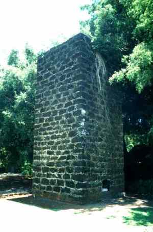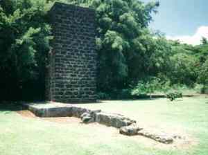 Easily accessible in the grass park of historic Old Koloa town. Old Koloa town is 4 miles north on Hwy 520 from Poipu on Kauai's South shore. Koloa district. REMAINS: One 30-foot, stone brick, sugar mill smoke stack and partial mill foundation. |