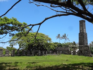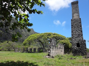 These ruins are on private, livestock & agriculturally zoned land. The smoke stack and building structure are near, therefore very visible from the roadside. The ruins are 2 1/2 miles south of Kaaawa, along Kamehameha Hwy (route 83), midway along Oahu's east coast. REMAINS: A moderate coral brick smoke stack about 35 ft. high; a partial small building |