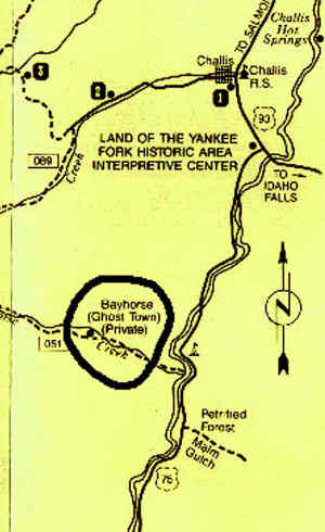 North of SunValley on highway on 93 west of the Salmon River a few miles is Bay Horse, a town that was almost a ghost town before it got started. Hopes for another gold mine to rival the mine at Leesburg faded quickly when only a small amount of gold was found. In the process, however, a rich vein of silver was discovered and Bay Horse had its start in the early 1870s. The most productive years were in the 80s and 90s before the vein began to be less productive. Operations continued until 1915 and then were shut down and the town abandoned. Of interest to tourists today are the charcoal ovens used to make charcoal for the smelter and some buildings along the dirt main street of Bay Horse. Submitted by Henry Chenoweth. ![]() Bayhorse Kilns Courtesy Rick and Brenda Homme ![]() Bayhorse Cemetery Courtesy Rick and Brenda Homme ![]() Bayhorse Main Street Courtesy Rick and Brenda Homme ![]() Bayhorse Mill Courtesy Rick and Brenda Homme ![]() Bayhorse Saloon Courtesy Rick and Brenda Homme ![]() Bayhorse Tram Base Courtesy Rick and Brenda Homme |