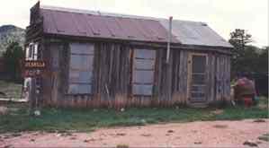 Jicarilla lasted for about 50 years (1892-1942). The majority of the town was built from logs, and that's why there isn't much left standing today. The chief industry was mining. During the depression, the population soared as the mines payed surprisingly well at that time. When the depression ended, most people moved on and Jicarilla soon faded. Today, there are few who still live in the area, and some still mine the area. The drive through the Jicarilla Mountains connecting the ghost towns of White Oaks to Ancho is a well spent morning or afternoon. Submitted by: Paul Lessard Native Mexicans worked the streambeds in the Jicarillas as far back as 1850 separating the gold from the dirt in a wooden bowl called a "batea." Prospecting for the lode deposits by American miners began in the 1880s with moderate success. The town of Jicarilla grew up around these miners and had a log cabin schoolhouse, a general store and a population of some three hundred during the depression years of the early 1930s. The town was a haven for destitute families during those years when mining was the only means available to produce even a meager income. When jobs became more plentiful, people moved on and the town began to die. Today a false front building, formerly the store and post office, still stands. The log schoolhouse also remains. Courtesy Henry Chenoweth. |
