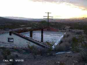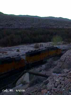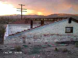 | Carp is located in the lower Meadow Valley Wash 35 miles south of Caliente. Its history is tied in with the Union Pacific Railroad. The post office started under the name of Carpsdale June 29, 1918, but was rescinded. It then officially opened under the name of Cliffdale June 7, 1921 and changing to Carp December 1, 1925. Carp PO remained to serve rural ranches until July 1, 1974; although it was out of business for nearly a year before it was discontinued. Little remains except a railroad siding usually occupied by idling trains awaiting passage of a train traveling in the opposite direction on the busy transcontinental route, and the remains of the watering reservoir. Submitted by: David A. Wright - Great Basin Research |