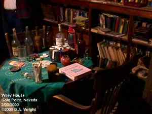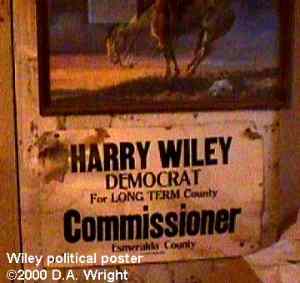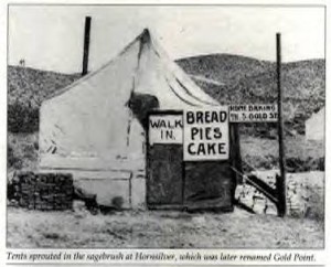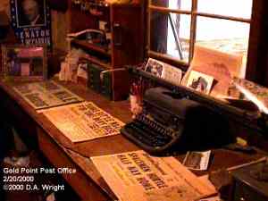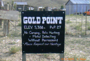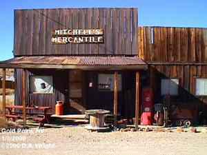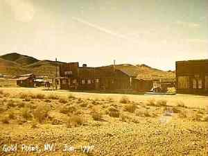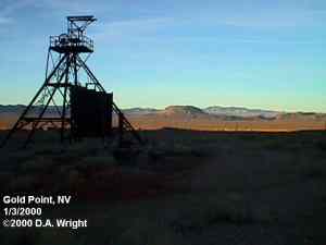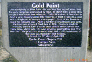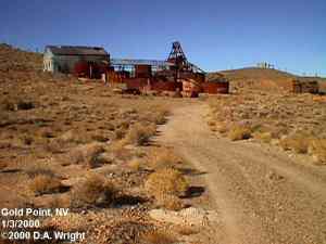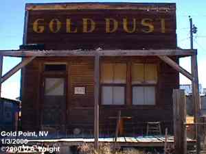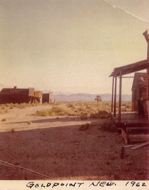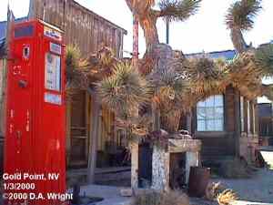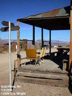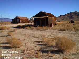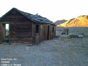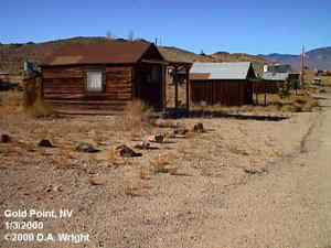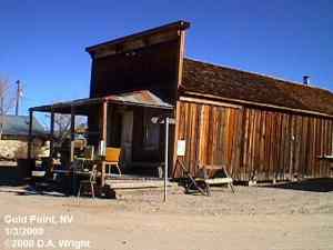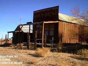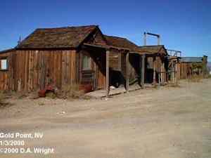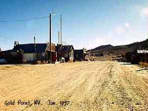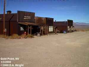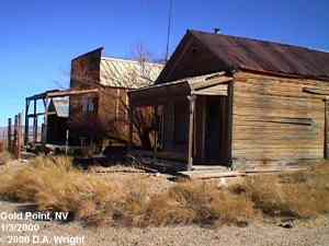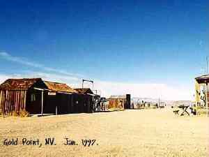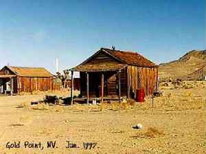 | Originally named Hornsilver because it was a silver mining camp, it never became the boomtown its founders had hoped. In 1929, the silver market offered nothing but bad news, investors decided that "Gold Point" would have more value as a name. At one time, two thousand people occupied the town, but legal and other problems confronted the operators. The lack of resolutions, for whatever the reason, killed the town. Gold Point is south of Goldfield off of highway 95. Most of the town is now owned by Herb Robbins, otherwise known as Sheriff Stone. Herb hosts many exciting outings and adventures at Goldpoint including the Ghosttowns.com Rally 2000! Submitted by: Shawn Hall from his book Preserving The Glory Days: Ghost Towns And Mining Camps Of Nye County, Nevada Click here to purchase his book! Gold Point was a general ranching area more than a town. There are a number of abandoned ranches in the area and in particular the old Fisher Ranch where a number of old buildings still remain. The most unusual building on the ranch is a most attractive false front, the original purpose of which is not known. The Gold Point area is well worth visiting just to see the false front. Historical Marker located at Gold Point Known originally as Lime Point, this area was first settled about 1880. The early camp was abandoned by 1882. In March 1908, a silver strike brought a new camp into existence. Called Hornsilver, it flourished for about a year, boasting about 800 residents, at least 11 saloons, a post office, telephone service and a newspaper. Most of the businesses closed the following year. After a number of small booms and bust, the town was renamed Gold Point in 1932. Two local residents eventually served in the Nevada State Senate, Harry DeVotie and Harry Wiley, whose wife, Ora Mae served as postmistress from 1942 until 1967. The post office closed in 1968, and in 1979 stabilization of the town was started by Herb Robbins. Dedicated this 18th day of April, 2004 Queho Posse, Chapter 1919 E Clampus Vitus Satisfactory! Submitted by Russell Beere ![]() Gold Point Courtesy Dolores Steele ![]() Gold Point Courtesy Dolores Steele ![]() Gold Point Courtesy Dolores Steele ![]() Mine area Courtesy Dolores Steele ![]() Mine area Courtesy Dolores Steele ![]() Mine area Courtesy Dolores Steele ![]() Gold Point Courtesy Dolores Steele ![]() Post Office and Store --- Store had bachelor quarters in rear where owner lived --- Just inside door of store was the Post Office window, leading to an attached house where the Postal lady lived. --- Later on the two people fell in love and were married and lived in the house. Courtesy Dolores Steele ![]() Gold Point Courtesy Dolores Steele ![]() Gold Point Courtesy David A. Wright Great Basin Research ![]() Gold Point Courtesy David A. Wright Great Basin Research