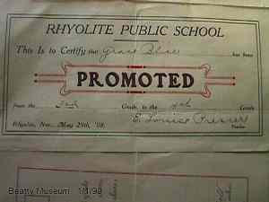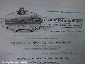 that was never filled to capacity. Submitted by: Shawn Hall from his book Preserving The Glory Days: Ghost Towns And Mining Camps Of Nye County, Nevada Click here to purchase his book! Rhyolite, Nevada: This is another article on Rhyolite from Nell Murbarger interviewing the remaining residents Rhyolite and Bullfrog, titled Ghost Town Dwellers. I think they got some of the pages out of order, but there's six photos, and its all informative. UPDATE:Your review of Rhyolite states, "A train station was built but not a single train ever arrived for railroad tracks to Rhyolite were never laid." Not true. I have a book on Rhyolite (pub. 1953) which describes both the Tonopah & Tidewater Railroad and the Las Vegas & Tonopah Railroad. The first passenger train into Rhyolite arrived on December 14, 1906. The LV&T went right through the heart of the residential district, while the T&T passed through the outskirts of town. At one time, the sidings could accommodate 105 train cars waiting to be unloaded of incoming freight and reloaded with outgoing ore. There is also a reproduction of a 1905 USGS map of Rhyolite, showing the layout of both railroads. --Jason Houston The Nevada gold rush of 1904-1907 was centered in three towns Goldfield, Tonopah, and Rhyolite. They were not close together but all are on U.S. Highway 95 with Tonopah in the north, Rhyolite in the south and Tonopah in between. Rhyolite's short-lived prosperity ended permanently and abruptly when its mines played out in 1909. Submitted by Henry Chenoweth. One of the most interesting stories of any ghost town in Nye County is that of Rhyolite. It began in 1904 with the rich discoveries in the hills west of what would eventually be the townsite. First a small camp called Bullfrog emerged. Then another camp named Rhyolite took form a mile to the north. It included numerous saloons, restaurants, and boardinghouses—all in tents. One of the first buildings constructed was the two-story Southern Hotel. The first post office was housed in a ten-by-twelve tent opened on May 19, 1905. Water was a rare commodity in the area and was carted in at a cost of $2 to $5 a barrel. It was not until June 1905 that Rhyolite had an efficient water system. In only one year, it had an abundance of water and three water companies. There were several small camps within a radius of a few miles of Rhyolite that eventually merged with the southern part of the rapidly expanding town. By the spring of 1905, there were three stage lines bringing supplies to Rhyolite. The first auto stage from the Tonopah and Goldfield Auto Company became active in 1905. Baseball became the town’s sports entertainment. Rhyolite built its first school early in 1906 and the enrollment soon reached 90. By May 1907 the number of students reached 250. A new two-story brick schoolhouse was built with classrooms and an auditorium. Rhyolite reached its peak in 1907 and 1908. Its population at that time was estimated to be between 8,000 and 12,000. The town was served by three railroads during its peak years. In January 1907 a network of 400 electric streetlight poles were installed to light Rhyolite twenty-four hours a day. A number of very impressive buildings were erected including a bank building and a large mercantile store. At its peak, the town had forty-five saloons, an opera house, a number of dance halls, a slaughterhouse, two railroad depots, and countless other buildings. It even had three public swimming pools. During Rhyolite’s brief reign of glory, more than eighty-five mining companies were active in the hills around the city. The financial panic of 1907 spelled doom for Rhyolite. Most of the town’s investors were from the East. When they withdrew their backing, all the mines were forced to close. The devastating effects of the panic did not affect Rhyolite until the spring of 1908. It was then the trains were almost always filled with people leaving town. By the end of 1909, the population was well below 1,000. The town continued to struggle to stay alive hoping for a new boom that never came. The population of the almost dead town had shrunk to fourteen by the beginning of 1920. The last resident died in 1924. Rhyolite is clearly one of the best ghost towns in Nye County and in the state of Nevada. ![]() Courtesy Kevin Ward themineralgallery.com ![]() Courtesy Kevin Ward themineralgallery.com ![]() Courtesy Kevin Ward themineralgallery.com ![]() Courtesy Kevin Ward themineralgallery.com ![]() Courtesy Kevin Ward themineralgallery.com ![]() Rhyolite residents Courtesy Dolores Steele ![]() Rhyolite Courtesy Dolores Steele ![]() Rhyolite Depot -- 1906 Courtesy Dolores Steele ![]() Rhyolite Courtesy Dolores Steele ![]() Rhyolite Courtesy Dolores Steele ![]() Rhyolite Courtesy Dolores Steele ![]() Three story - Overbury building & Jewely Store Courtesy Dolores Steele ![]() Rhyolite Courtesy Dolores Steele ![]() HD & LD Porter Store - 1906 -- Sold everything needed in the mining town. Slogan was "We handle all things but whiskey" Courtesy Dolores Steele ![]() Bullfrog - Rhyolite Cemetery -- 1904 - 1912 Courtesy Dolores Steele ![]() Rhyolite Courtesy Dolores Steele ![]() J.S. Cook Bank building. Exposure approximately 2 minutes w/strobe flashed at multiple points. Multiple images of David A. Wright. October 1990. Courtesy David A. Wright ![]() Billhead of the Rhyolite bottling works. Located at Beatty Museum. January 1, 1999. Courtesy David A. Wright ![]() Rhyolite's taste can be ascertained by this can, which reads "Blue Point Fresh Oysters." Found near Bullfrog Jail, January 1, 1999. Courtesy David A. Wright ![]() An old Frasher Fotos post card taken in Rhyolite c.1920. David A. Wright collection. Courtesy David A. Wright