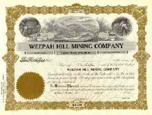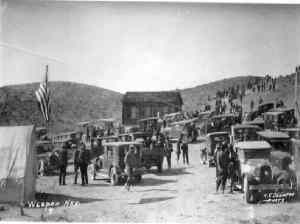 Meanwhile the great boom camp promoter George Graham Rice - promoter of Greenwater, Goldfield and Rawhide - was busy with legal matters in the East at this time (namely his prosecution for fraud). It is reported that Rice had interests in promoting Weepah, but by the time Rices resident agent arrived, the only real significant finds had already been worked out. And this was the crux of the matter. A large, shallow deposit had been discovered by two young prospectors working the area - ostensibly searching for the so-called lost Breyfogle mine. The problem was that this single find was the only real deposit of any real value in the area. The geology of the Weepah district suggests that there may be other pockets of rich ore at varying depths, but the patchy nature of the deposits and the technology of the time did not allow the district to develop any further. So Weepah lies fallow to this day. Typical of the era, mining stock promotion was rampant, and an example of a Weepah stock certificate is included above. The real lesson for researchers is that an estimated one thousand five hundred people camped out in their cars in a remote area of the Nevada desert between April, 1927 and November, 1927 - looking for their personal El Dorado. An El Dorado that never became a reality. (I have not included a modern photo here because only detritus remains.) [This essay is an original work of Steve Bruce ([email protected]) based on research according to publications by R. Greenwood and G.G. Rice. The photos displayed here are from old picture postcards and they are not subject to copyright restrictions] |