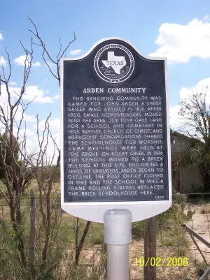 | Arden, on Rocky Creek was named for John and Katie Arden, who settled a claim at the site by 1885. The community acquired a post office in 1890 with W.P. Moore as postmaster. A local public school was established in 1892. Two short-lived schools had operated before this in Arden district, one on Rocky Creek and the other at Sawyer. In 1915 Arden had a post office, a school, a church, and a population of fourteen. In 1947, When the community had one business and thirty residents, the Arden School was consolidated with the Mertzon. All of the businesses had been abandoned as of 1966, execept for a polling place used to preserve precinct lines. The passing of the school, low cotton prices, drought, and better opportunities in nearby larger towns were the primary causes for the decline of Arden. Since 1952 an Arden reunion has been held each Labor Day on Rocky Creek.This was taken from the New Handbook of Texas Vol. 1 page 235 Submitted by: Texas Wandergoing, Inc. |
