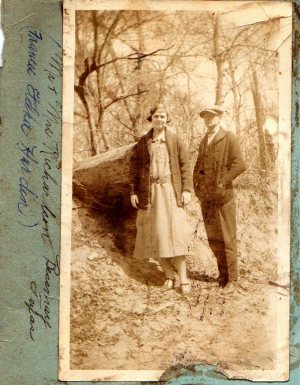 | Two historians have written a bit of Bessmay. Harold Willis of Hardin County wrote: "... located on the Santa Fe Railroad just east of the Neches River in Jasper County. It was built by Kirby Lumber Company and named for Bessmay Kirby, the only child of John Henry Kirby. It was a large mill, with a commissary, post office, and several small businesses. The town was abandoned when the mill burned in 1949." http://www.geocities.com/hardincounty/placesforgot.htm W.T. Block wrote in an article to the Beaumont Enterprise, Saturday August 21, 1999: "...also to be known as "Mill R" in its alphabet soup of mill identities. The new town, 2 miles north of Buna, was named Bessmay, after Kirby's only child. ... The town also had a large mill office, commissary, post office, physician's office, and hotel. The 200 residences of Bessmay were segregated into white and black sections to conform to the living patterns of that age. W. H. Preston was the first mill superintendent. In 1907 the Bessmay sawmill cut 58 million feet of lumber, which probably was its banner year. By 1918, production was down to 46.5 million feet, and its 716 mill employees were paid a total of $452,000 in wages. Bessmay was built on swampy land, and after a rain, employees had to wear rubber boots to work because of the muddy streets. Nevertheless many men spent a lifetime working there. Dave Bird, who began as band sawyer in 1905, was promoted to plant superintendent in 1929, and filled that post until 1942. Joe Marriott, who began as chief carpenter in 1903, still held that title in Nov. 1935, the month that Beaumont Enterprise published 4 articles about Bessmay, as follows: "...People in Bessmay 25 years ago were much different than today. There was no law here then, every man making his own law. The superintendent wore a gun, and many residents also.... Boys who stayed at the hotel shot at box cars on the siding... Once they saw something running out... it was whiskey dripping from a bullet hole in a barrel..." By 1935 some Bessmay streets were blacktopped. Houses had electricity and running water, and employees paid a nominal monthly rent. Company-filled medicine cost 10 cents for one prescription. The grammar school had 5 teachers, but older students were bused to Buna schools. " http://www.wtblock.com/wtblockjr/bessmay.htm Submitted by: Sherry Wilkinson | ![]() Mr. Richardson & Frances Etelka Hardin, now Mrs. Richardson, in the woods surrounding Bessmay, where they moved to from Silsbee, Hardin Co. Courtesy Sherry Wilkinson |