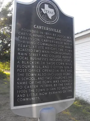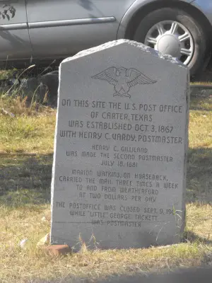 | Carter TX was established 1866-1867 around a flour mill on Clear Fork Creek. Many Indian raids and gunfights at Carter. Population dwindled due to its proximity to Weatherford added to by natural disasters was the demise of Carter and it was nothing but a member by the 1920's Submitted by: Phyllis Clark |