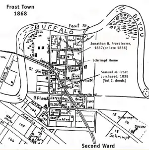 | Frost Town was an early settlement along the banks of the Buffalo Bayou in what is today Houston. Originally settled in 1822 by Dr. James Phelps and his wife, it got it's name from Col. Jonathan B. Frost who settled there in 1836. For a while Frost Town was also called Germantown due to the large amounts of German immigrants who settled there. Frost Town was a thriving community with its own post office, cemetery, school, volunteer fire department, brewery, and several places of worship. This all changed in the late 1880's when the post office closed and the population declined. The Frost Town cemetery has since sunk into the Buffalo Bayou and the last remaining Frost Town building was demolished in 1992 to make way for a freeway expansion. Submitted by: Daniele Moore | ![]() Old Map of Frost Town Courtesy Daniele Moore |