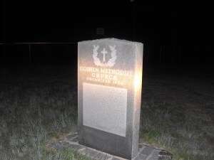 | Goshen was eight miles northeast of Eustace in Henderson County. A post office opened in 1871, and by 1885 the settlement had a population of 150 with two churches, a district school, three general stores, four gristmills,a couple of cotton gins, a hotel, and a saloon. During the early 1890s, the town began to decline, and by 1896 the population was only twenty-four. The post office closed in 1905, and by the mid 1930s only a church, a school, and a few houses remained at the site. After World War II most of the remaining residents left the area, and by the early 1990s Goshen was abandoned. The only thing left of the town of Goshen is the cemetery. The cemetery was established when a cowboy from a nearby ranch died. He is buried at the cemetery, enclosed by a wall of rocks. As he was a drifter..no one knew his name. Submitted by: Holli Boone Kees | Marker at Goshen, TX Cemetery is in the background. 6/6/09 Courtesy Trinay Haynes |