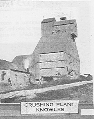 1 mile south of Knowles on private property, you can see the remains of the kilns and crusher from the road. REMAINS: Crusher remains, two kilns and walls of blacksmith shop |